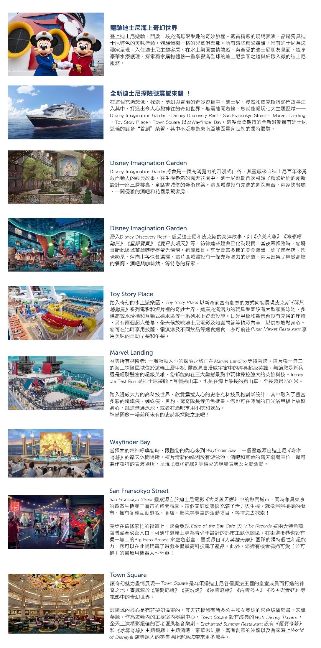 無需離開遊輪,您就能暢玩七大主題區域-Disney Imagination Garden、Disney Discovery Reef、San Fransokyo Street、Marvel Landing、Toy Story Place、Town Square以及Wayfinder Bay。