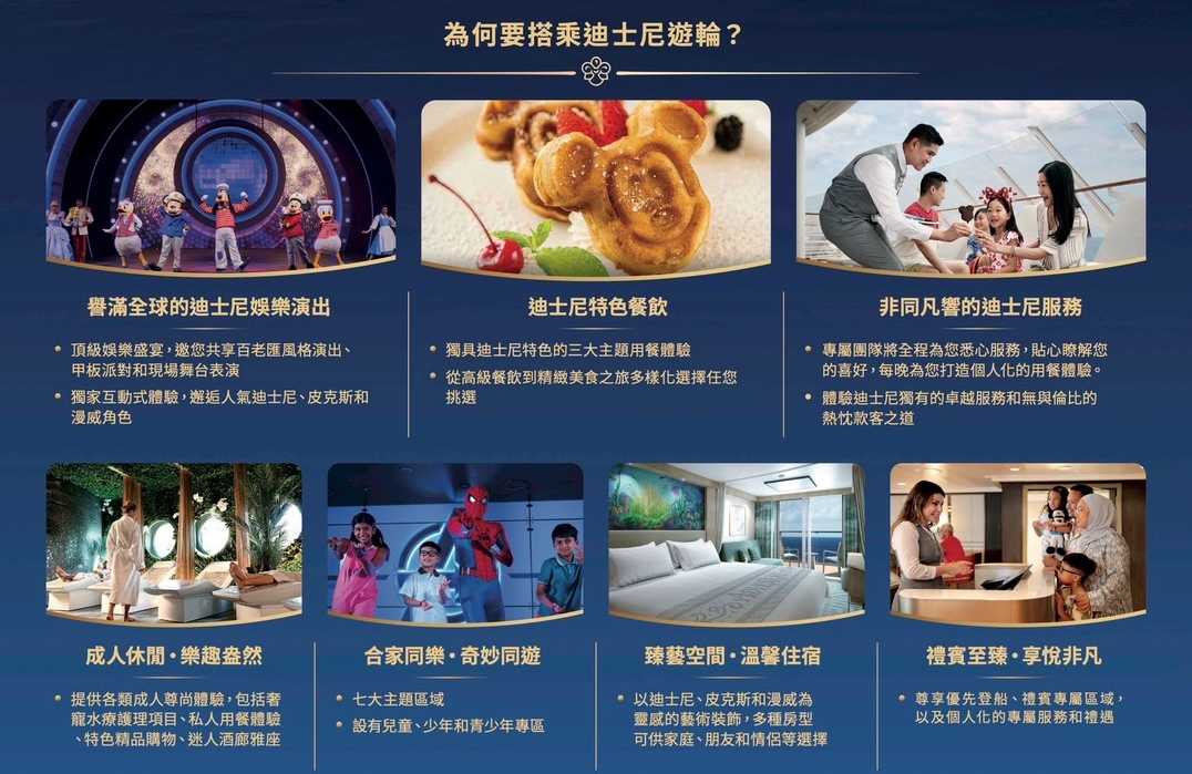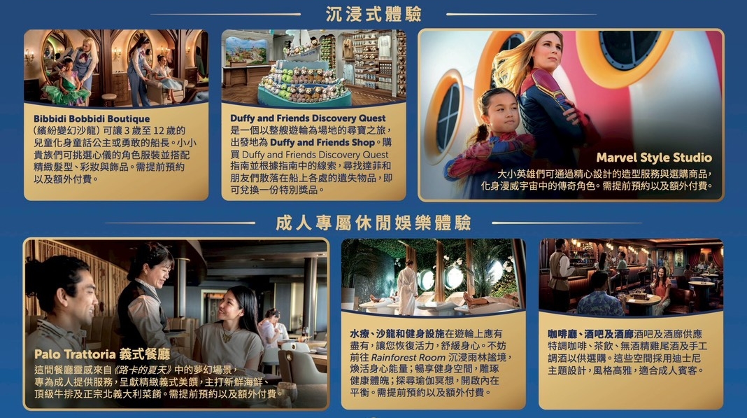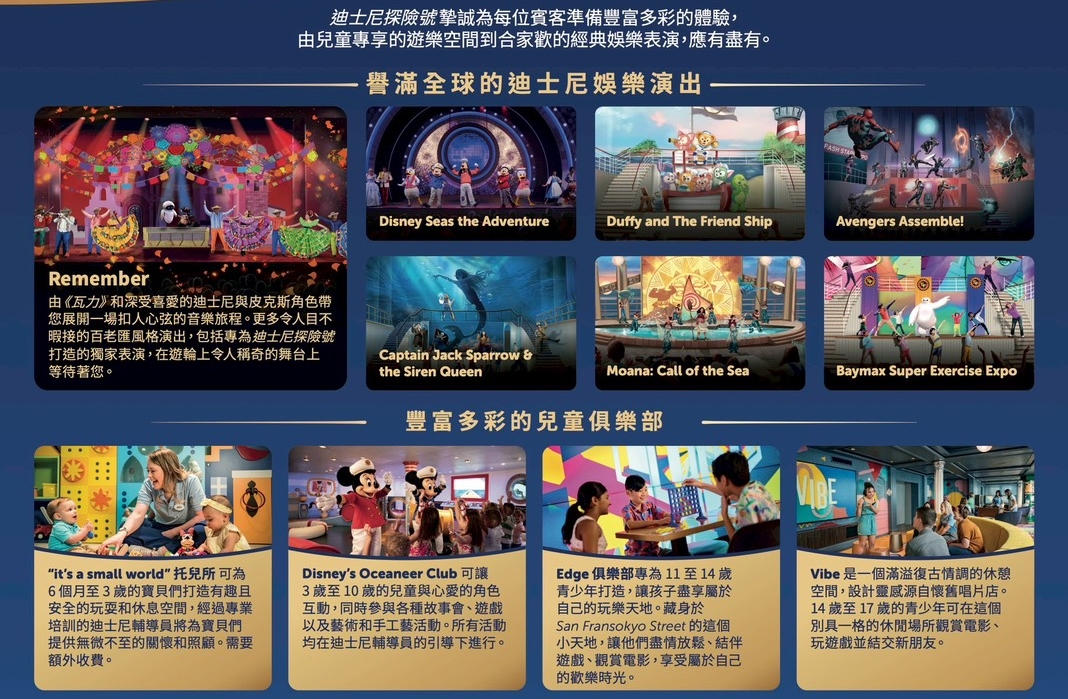 開啟一段充滿無限樂趣的全新探險之旅。迪士尼探險號 (Disney Adventure) 既是旅程,也是目的地。遊輪上滿載歡樂與閒適, 精彩絕倫的娛樂演出,卓越非凡的賓客服務以及迪士尼特色主題餐飲美食等。 此遊輪從新加坡啟航,為賓客提供3晚或4晚的行程並擁有迪士尼遊輪的許多「首創」榮譽。在這片充滿想像、探索、夢幻與冒險的夢幻遊輪中,迪士尼、皮克斯和漫威將熱門故事注入其中,創造令人心馳神往的奇幻世界。