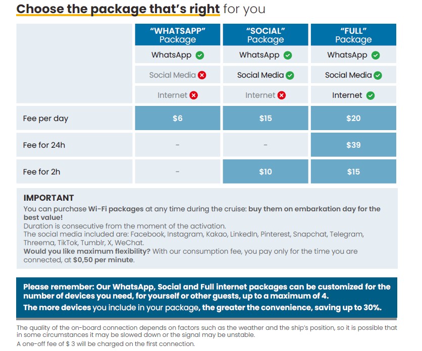 郵輪上有Wi-Fi/網咖可提供網際網路 Internet、電子郵件的服務,全船有wifi覆蓋,您可選擇船上所提供的衛星網路消費套餐,在船上一樣也可以遨遊於網際網路裡。(下列報價以美金計價